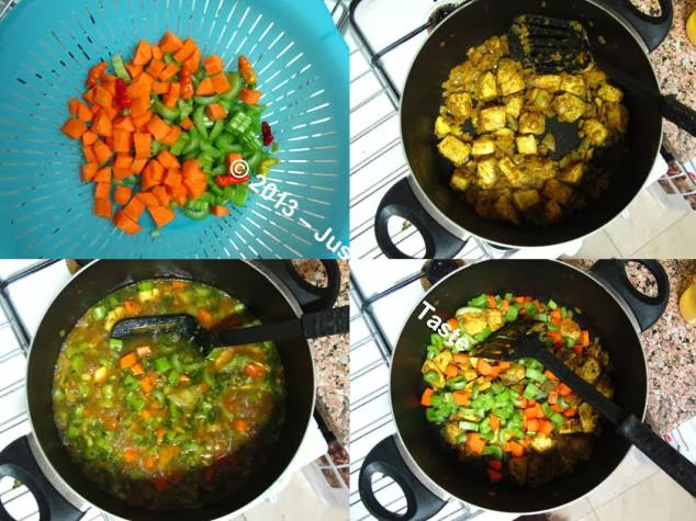 Ketika wortel sudah setengah matang masukkan buncis dan kentang. Tambahkan garam kaldu jamur dan lada bubuk. Biasanya menggunakan beragam sayuran yang sesuai selera.